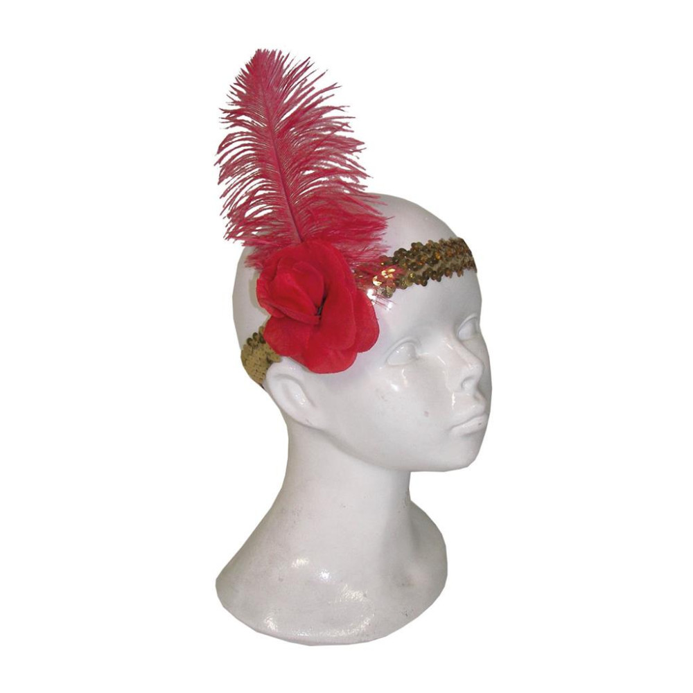 Čelenka zlatá s červeným kvetom a pierkom