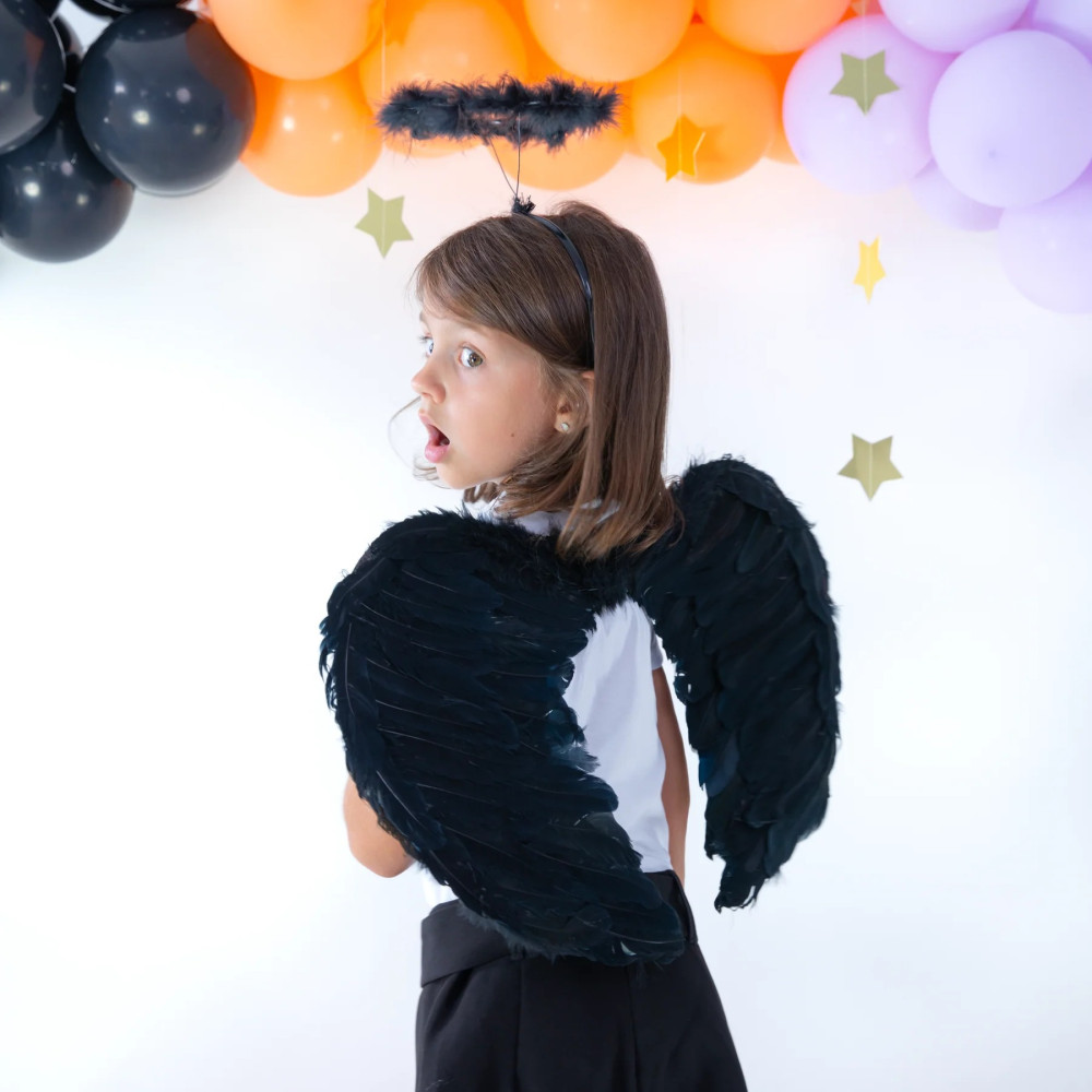 Doplňte svoj kostým o tieto elegantné čierne anjelské krídla s pierkami, ktoré dodajú vášmu vzhľadu tajomný a štýlový nádych. Ideálne pre Halloween, karnevaly, tematické párty alebo divadelné predstavenia.