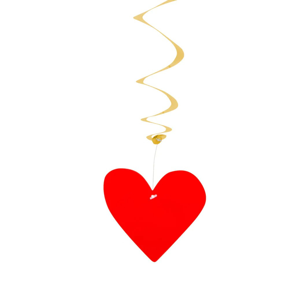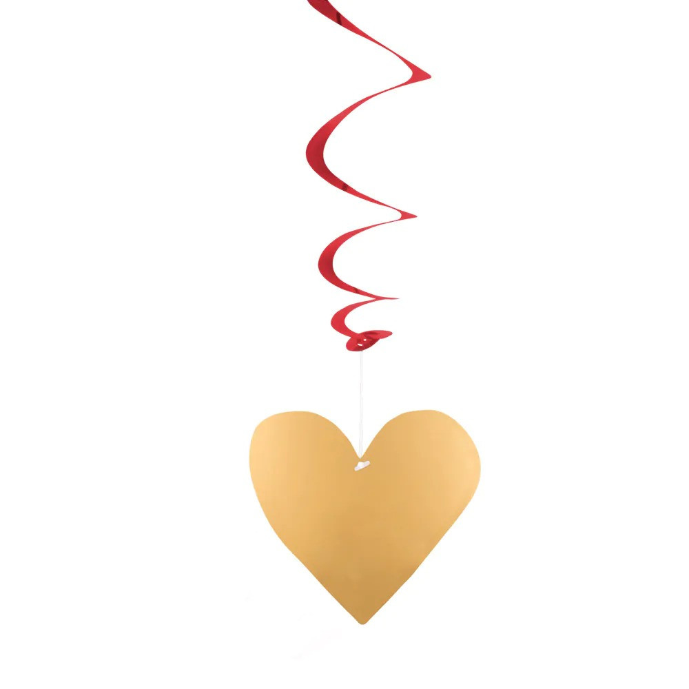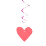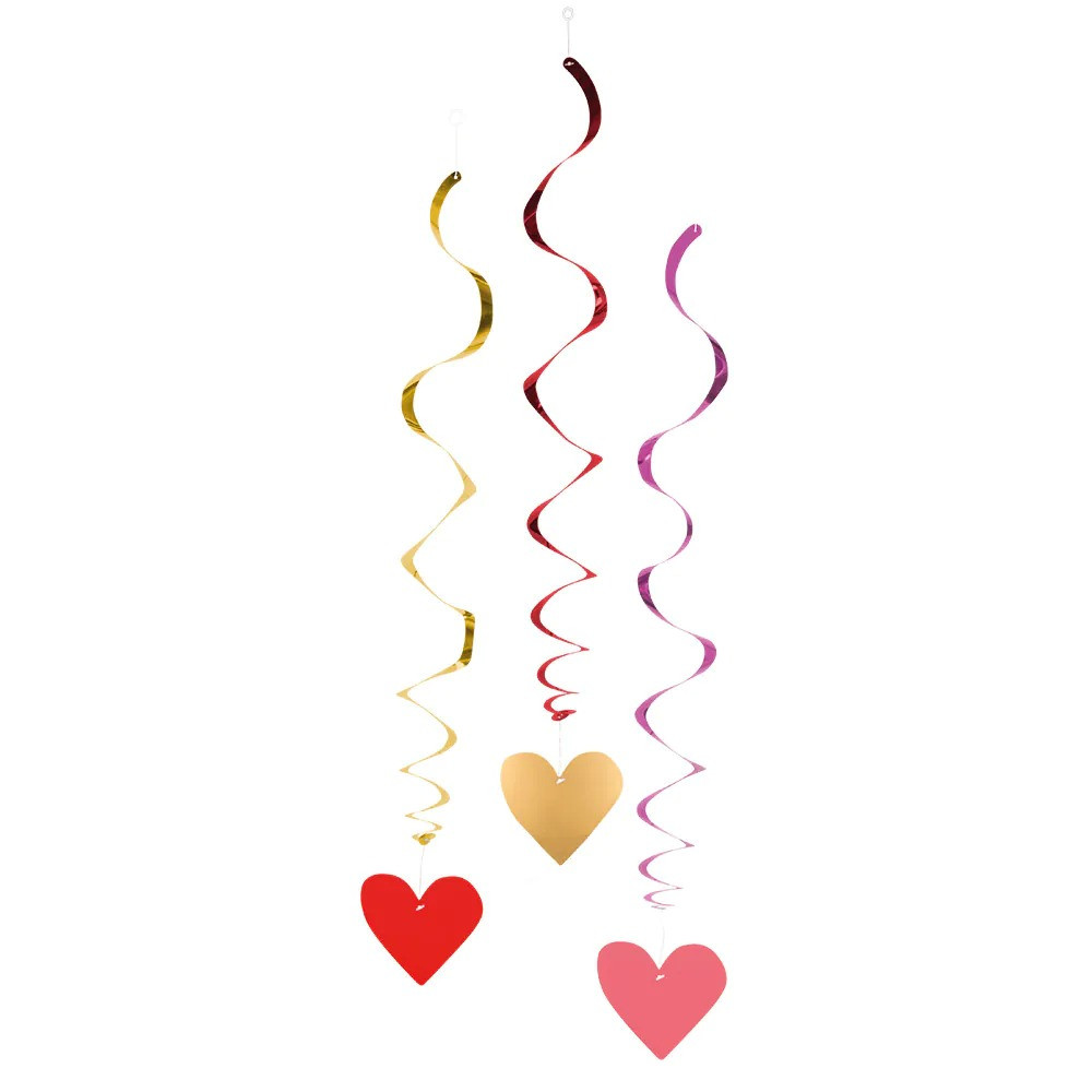 Sada obsahuje 3 visacie dekorácie v tvare dlhých papierových/ PVC spirál, ktoré sa pri zavesení na strop alebo dvere elegantne točia a vytvárajú pútavú party výzdobu s motívom srdca „Love“. Každá spirála je dlhá približne 85 cm a na jej konci je pripevnený symbol srdca.