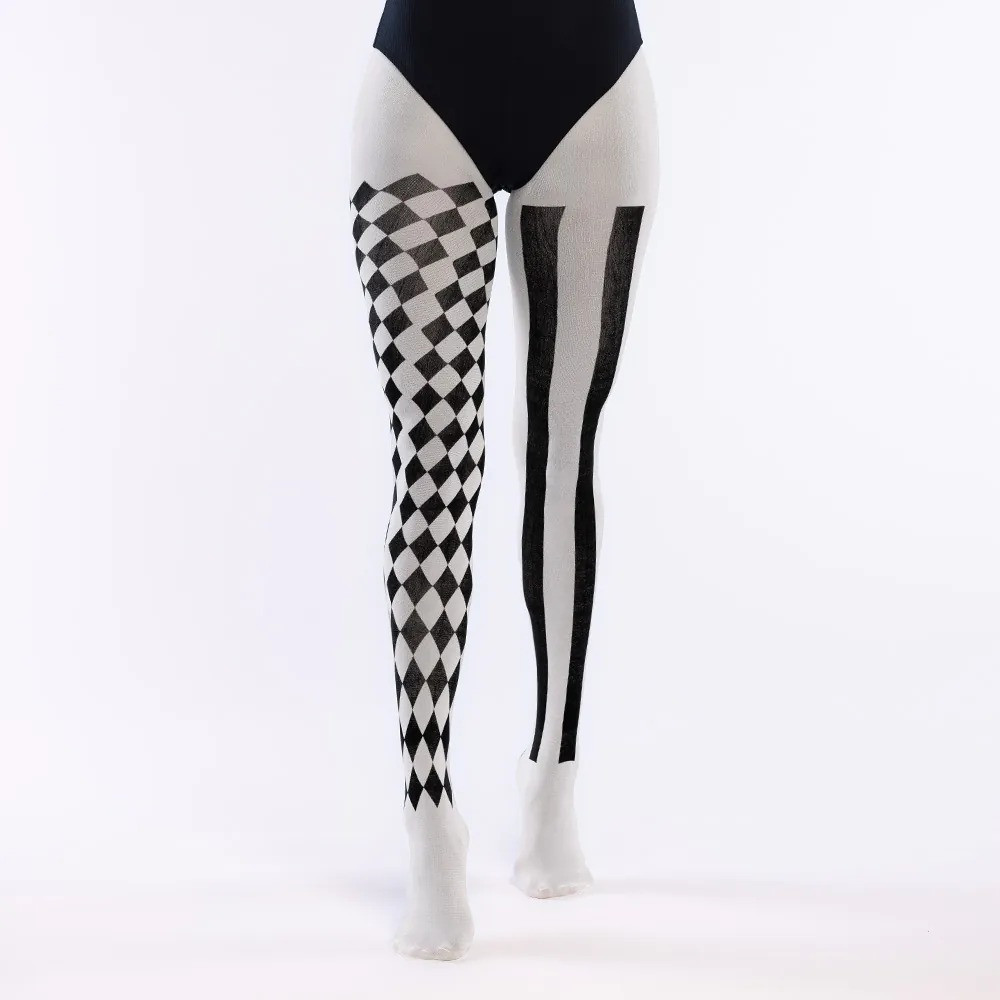 Oživte svoju párty alebo tématický event štýlom klauna či harlekýna! Tieto čierno-biele pančuchy s asymetrickým vzorom (jedna noha kocky, druhá pruhy) sú perfektným doplnkom na karneval, Halloween, cosplay alebo odvážnejší módny look.